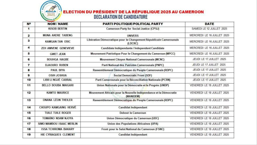 25 candidats à la candidature en vue de l’élection présidentielle du 12 octobre 2025 ont déjà déposé leurs dossiers respectifs à Elections Cameroon, à la date du 18 juillet 2025. D’autres dossiers de candidature sont attendus avant la clôture de la réception le 21 juillet prochain.