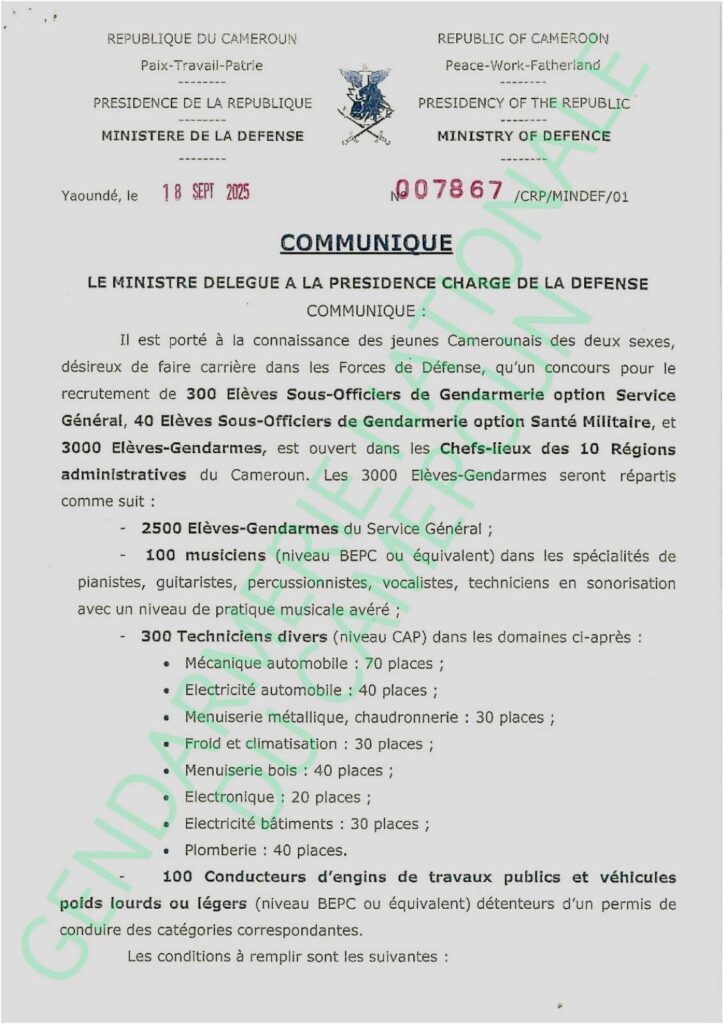 Les aspirants doivent faire preuve d’une bonne moralité et n’avoir jamais été condamnés par la justice camerounaise. Ils doivent aussi être physiquement aptes à subir les épreuves médicales, intellectuelles et sportives prévues dans le processus de sélection. Le niveau académique minimum requis est le Brevet d’études du premier cycle (BEPC), le Certificat d’aptitude professionnelle (CAP), ou le GCE/OL. Une taille minimale de 1,66 mètre est exigée pour tous les candidats qui doivent déposer leurs dossiers au plus tard le 28 novembre 2025.