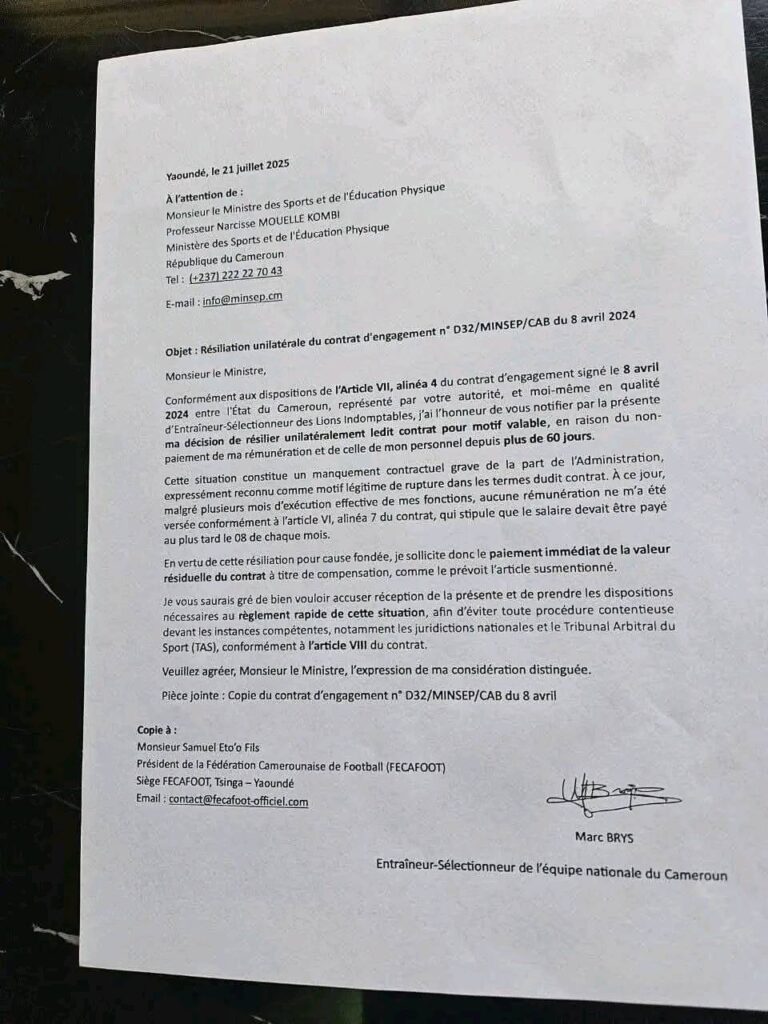 Marc Brys a déposé mercredi au ministère des Sports, sa lettre de démission, datée du 21 juillet 2025.Nommé en avril 2024 par le ministre des Sports et de l’éducation physique (MINSEP) Narcisse Mouelle Kombi, sans consultations de Samuel Eto’o, président de la Fecafoot, Marc Brys a rendu sa démission. Il a signé sa lettre de démission le 21 juillet et déposé au ministère des Sports le 22 juillet.
