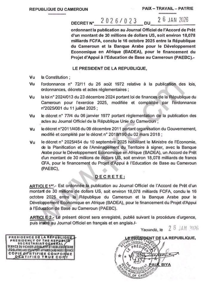 C’est désormais officiel. Par décret présidentiel, le chef de l’État, Paul Biya, a ordonné la publication au Journal Officiel de l’Accord de Prêt destiné au financement du Projet d’Appui à l’Éducation de Base au Cameroun (PAEBC). Cette ratification s’inscrit dans la continuité de décisions prises en septembre 2025. À cette date, trois décrets présidentiels avaient autorisé la mise en œuvre du PAEBC pour un montant global dépassant 36 milliards de FCFA, incluant celui validant le prêt de 30 millions de dollars auprès de la BADEA.